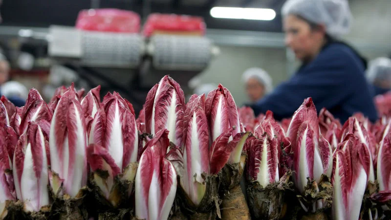 Red endives at the California Vegetable Specialties indoor farm in Rio Vista, California (April 20, 2006). The growing process is long and fragile, with the endives' roots grown outside first and then moved in, where they are left for up to 11 months to grow into mature endives in total darkness.