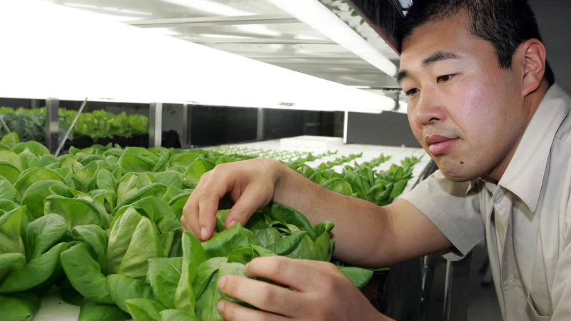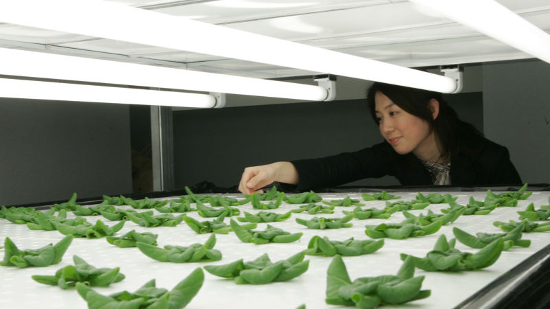 A staff of "Pasona O2" checks vegetables grown under fluorescent lights.