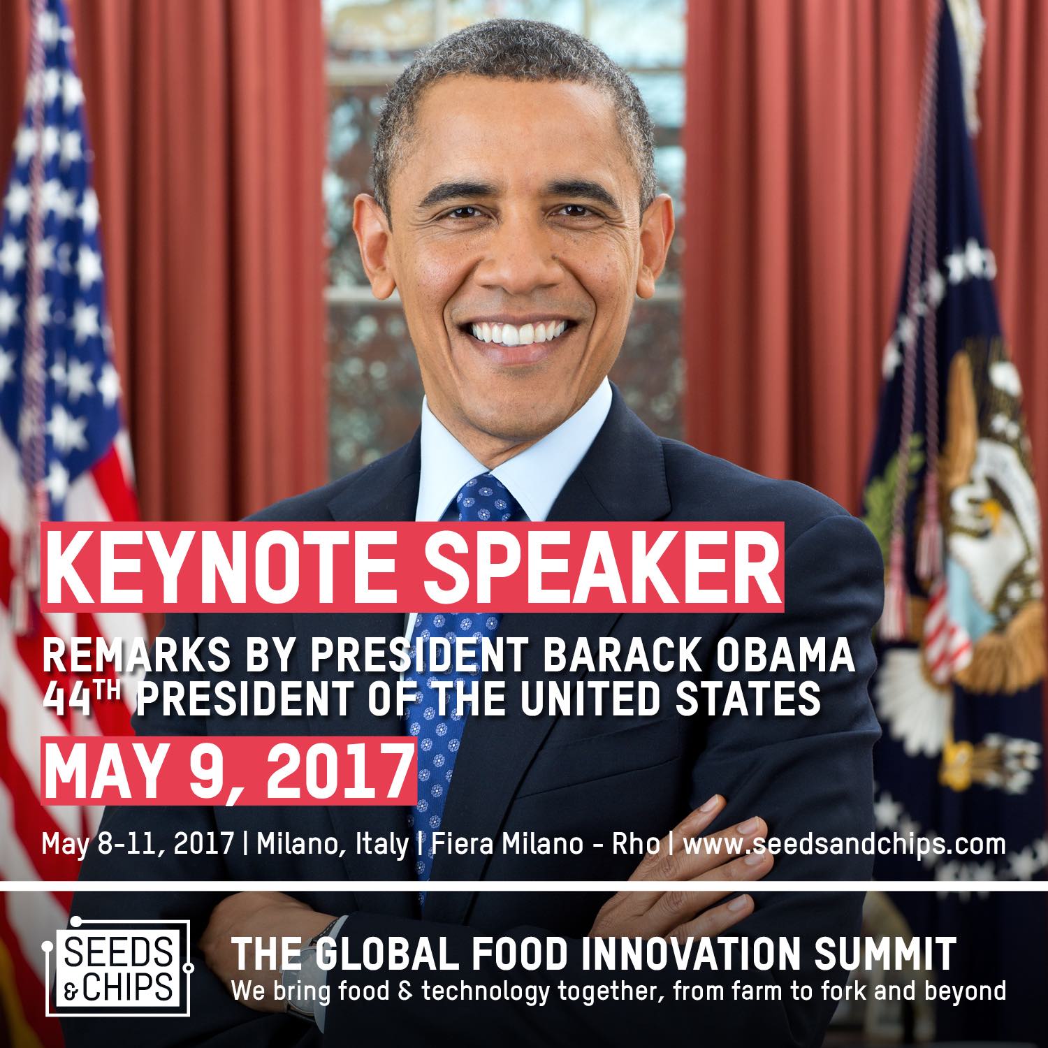 The 44th US President Barack H. Obama will be the guest of honor at 2017 Seeds&Chips - The Global Food Innovation Summit, taking place in Milano (Italy) from Monday 8 to Thursday 11, May 2017 at Fiera Milano-Rho. The President will be at Seeds&Chips on Tuesday May 9, where he will hold a keynote speech as well as a conversation together with Sam Kass, Senior Food Policy Advisor to President Obama and promoter of White House’s health-conscious revolution.
