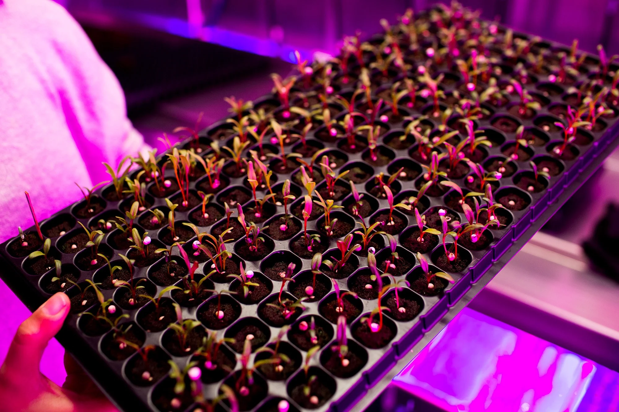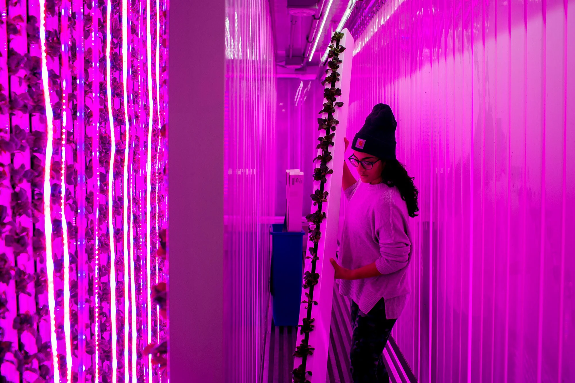 Peggs gave me a tour late last year as the first crops were maturing. The farmers themselves were not in attendance. Every season is growing season in the ag tech world, but once you’ve planted and until you harvest, your farms can generally be run on an iPhone, and virtually all the operations are cloud-based. Peggs unlocked the back of a truck and lifted up the sliding door to reveal racks of some sort of leafy greens. Everything was bathed in a hot pink light, making it look like a set of a generic sci-fi movie. (That’s because the plants need only the red-blue part of the color spectrum for photosynthesis.) Also, the baby plants seemed to be growing sideways. “Imagine you’re on a two-dimensional field and you then tip the field on its side and hang the seedlings off,” Peggs says. “That means you’re able to squeeze the equivalent of a two-acre outdoor field inside a 40-foot shipping container.”