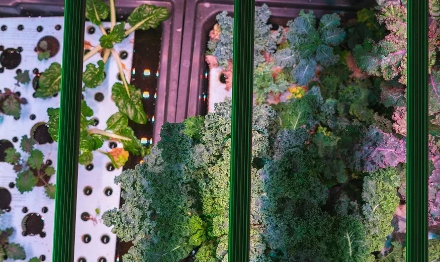 Kale and rainbow swiss chard in the R&D facility's deep water channel setup being used at Toledo aquaponics farm, which is controlled environment agriculture, using no pesticides, allowing immediate consumption of produce. Photo by Jeff Kamp of Plur Films.