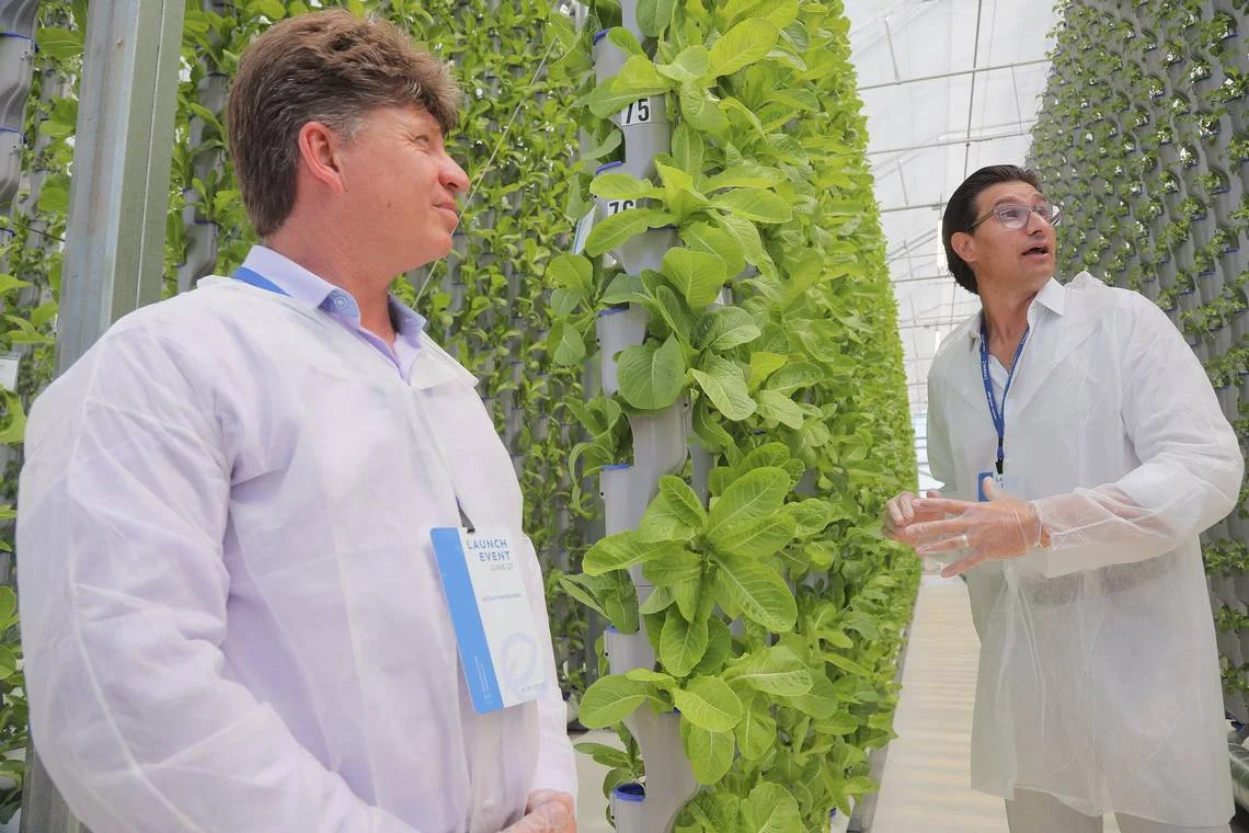 Jacques van Buuren, chief operating officer of Eden Green Technology, and company co-chair Jaco Booyens give a tour of the Cleburne greenhouse at the launch of Eden Green, a Dallas-based "next-generation vertical farming company" that has plans to grow nationwide. Rodger Mallison rmallison@star-telegram.com