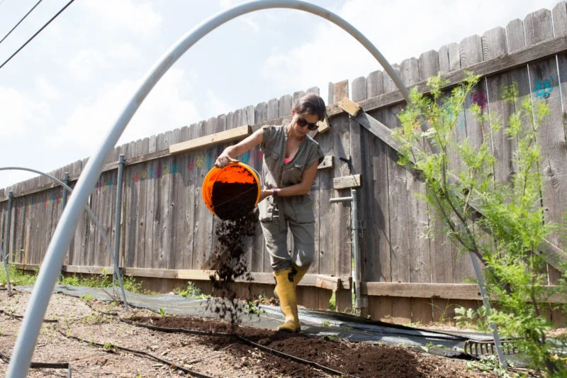 Rodriguez Boughton pours a layer of topsoil to prepare a new area for seedlings. Lynda Gonzalez/Reporting Texas