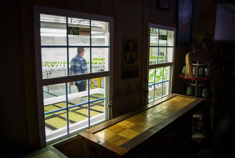 Nick Burton demonstrates how hydroponically grown lettuce is harvested in a grow house at Paris Victory Gardens.