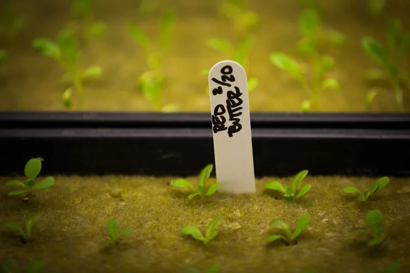 Red Butter lettuce seedlings sprout in a grow house at Paris Victory Gardens.