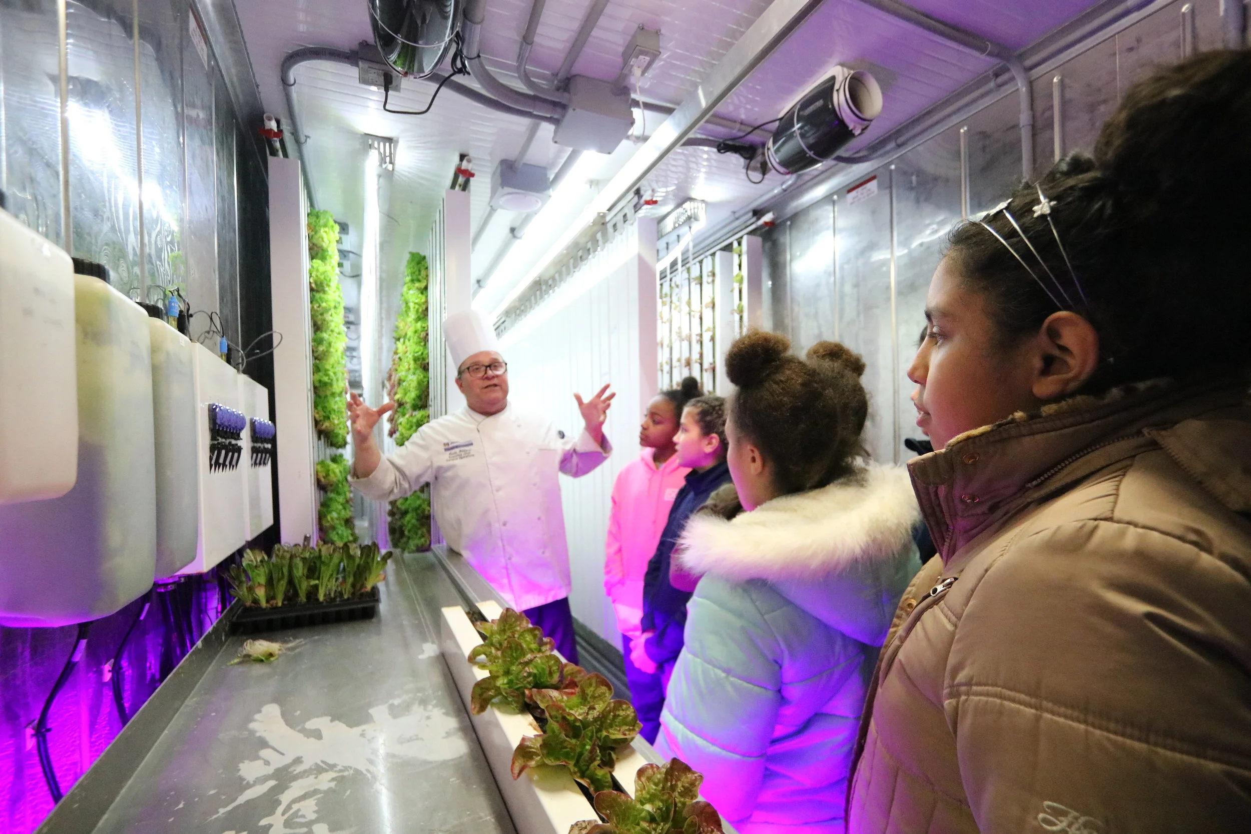 Boston high school students visit the Freight Farms shipping containers, learning about innovations in agrotech.