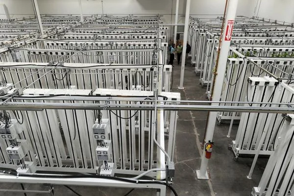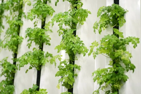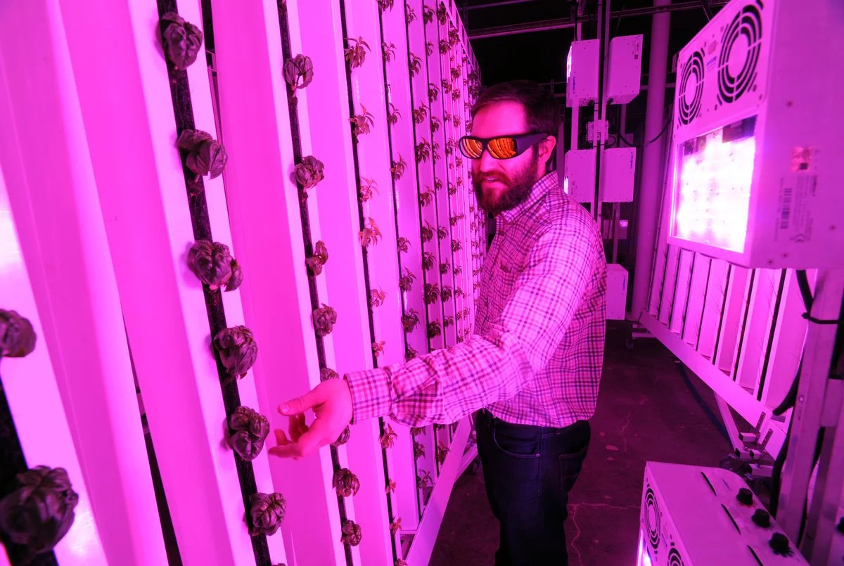 Inside a warehouse off Arctic Boulevard last month, violet light bathed rows of tall white columns. Leafy greens poked out in vertical rows, marked with handwritten labels for romaine lettuce and parsley.