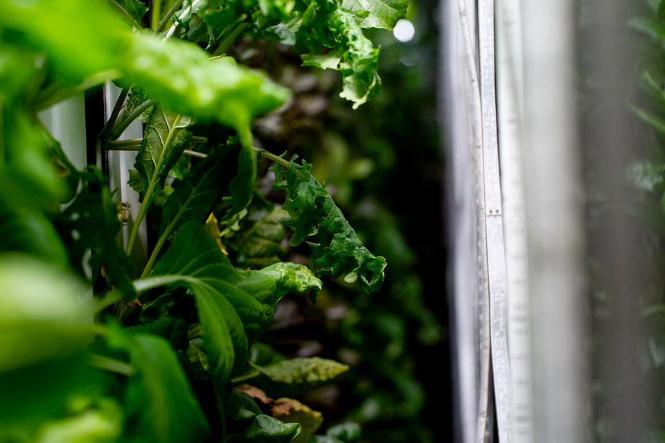 Inside the farm are rows of leafy greens -- lettuce, arugula, swiss chard, kale, and herbs - nestled inside vertically hanging tubes, each connected to a controlled water source and surrounded by strips of grow lights.