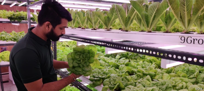 Himanshu Aggarwal grows lettuce, microgreens, and herbs in an 800-square-foot enclosed room in New Delhi. (Anjana Pasricha/VOA)