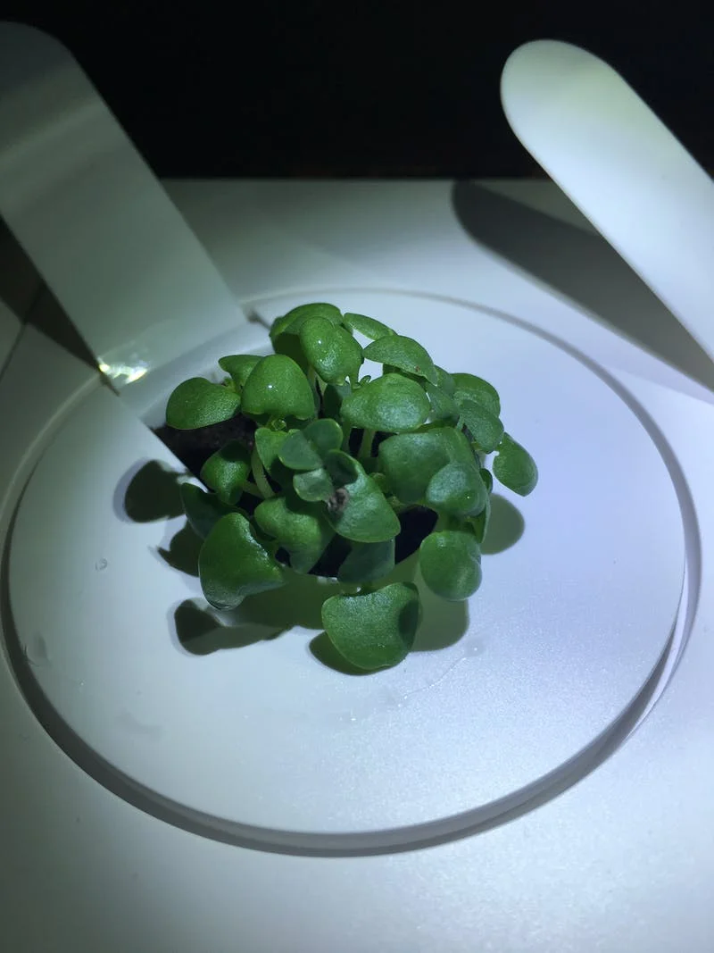 My husband and I went away for the weekend. Before we left, I filled up the water reservoir (something I'd had to do a few a times now) and briefly wondered if I should add the second included arm, which would move the light higher away from the plant. I decided against it because we were in a hurry and I wasn't sure it was necessary. Turns out, it was. The plant grew as tall as the light and some of the leaves got burned as a result. Ecks. Was this the beginning of the end, I wondered?
