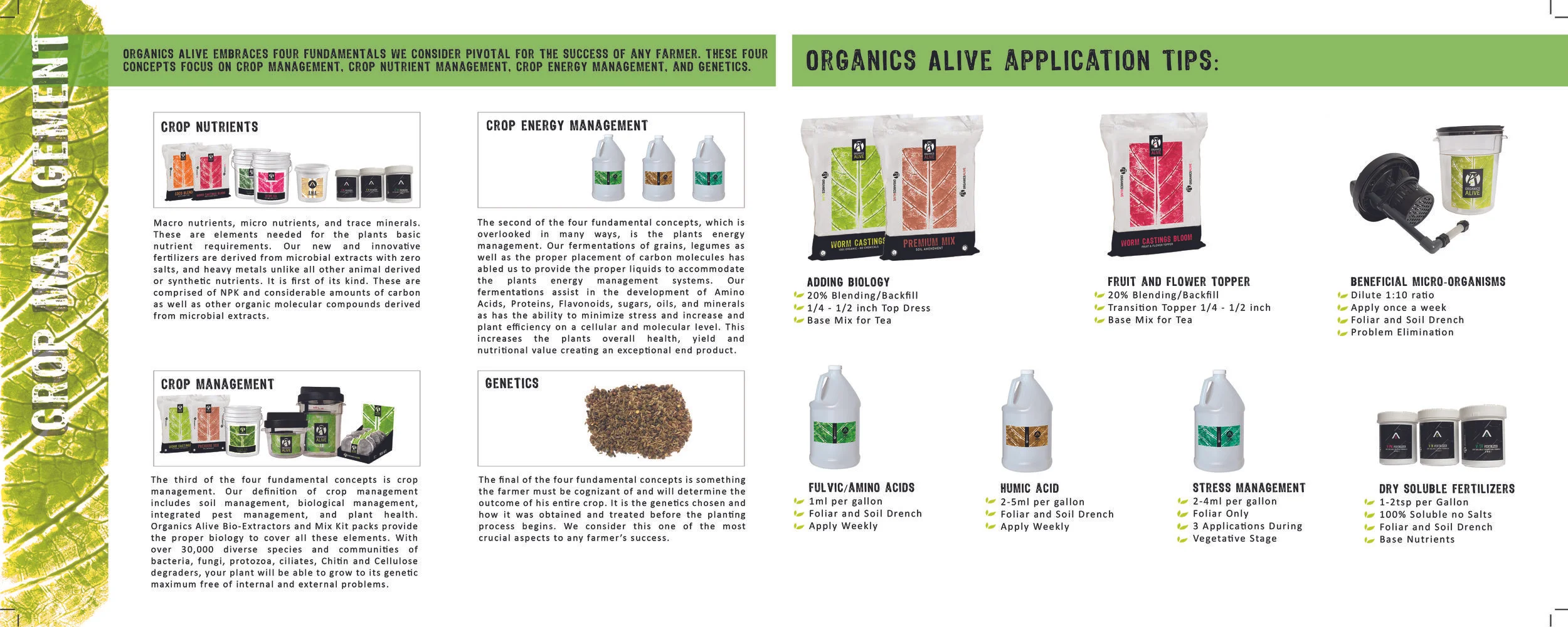Organics Alive focuses on four main concepts: Crop Nutrient management, Genetics, Crop Management, Crop energy Management. By addressing these four concepts your garden will be more bountiful, your crops immunity will increase, and fruits will be much richer in profile increasing financial and nutritious value.