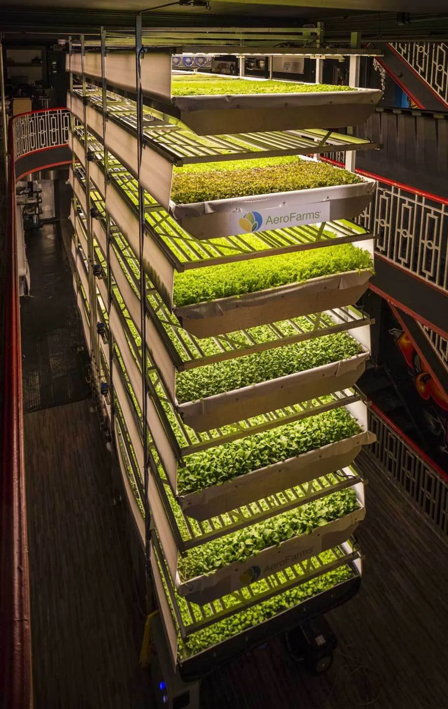 Aerofarms grows leafy greens, carrots, potatoes, etc. in its vertical farms and claims it is 130 times more efficient than a conventional farm. Source: Aerofarms