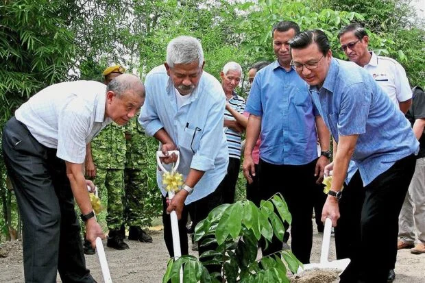 (Front row, from left) Prof Zhang, Bentong Cultural, Art and Heritage Association president Professor Datuk Dr.Mohamad Najib Ahmad Dawa and Liow planting a tree to mark the launch of the construction of a Bentong ginger processing factory.