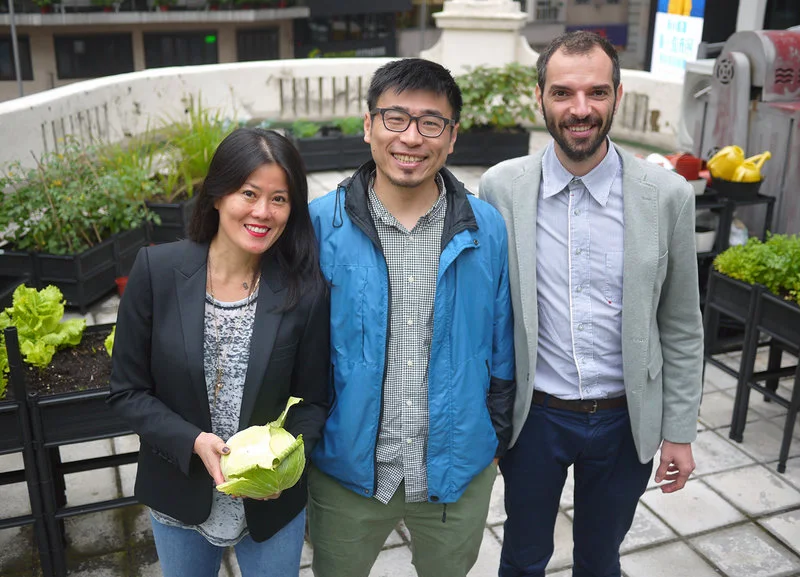 Client Gina Ma (left) stands with Rooftop Republic's Andrew Tsui (center) and Pol Fàbrega amid the rooftop garden of a French restaurant in central Hong Kong. Rob Schmitz/NPR
