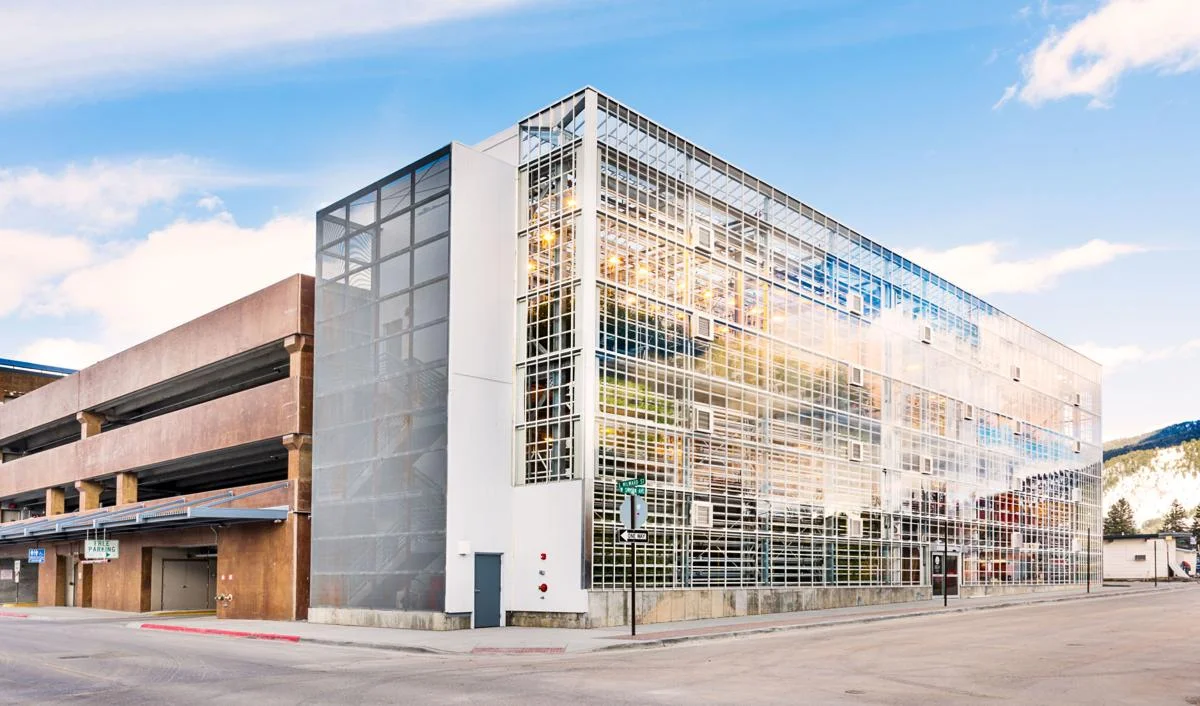 Vertical Harvest of Jackson Hole adjoins a parking garage in Jackson, Wyoming.