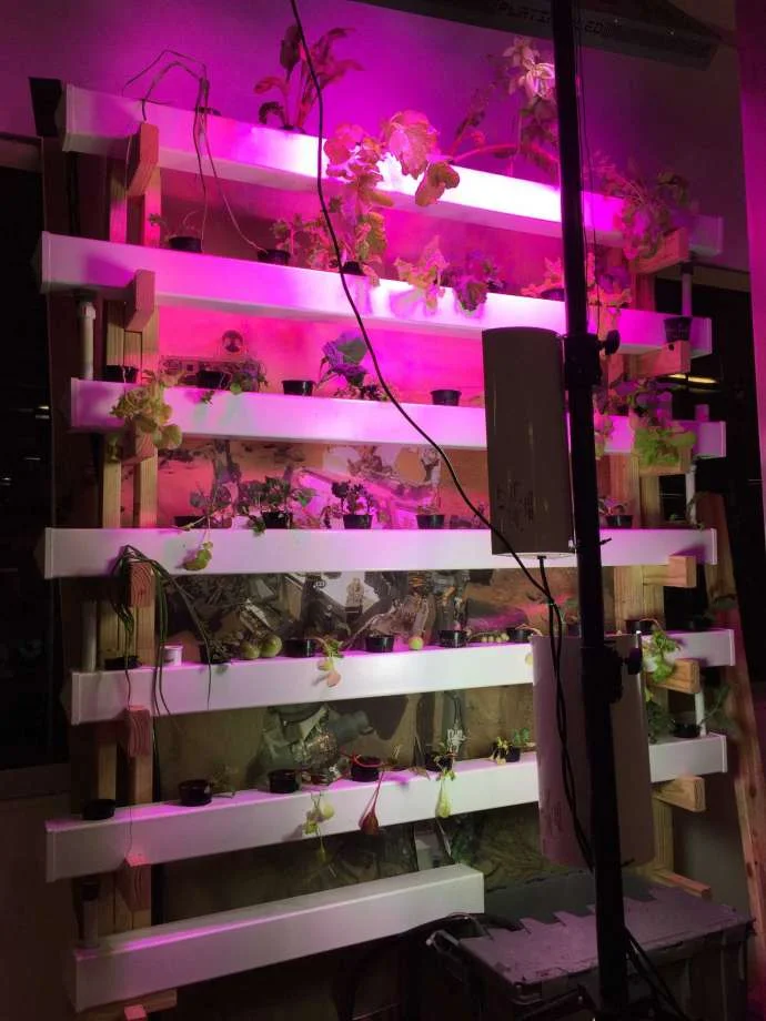 The team has been working on the project since August, and created two versions, both with vegetables growing hydroponically - without soil. The first prototype is in an enclosed area outside. It is based on a triangular frame, has three circular grow tubes, and two pumps with inputs into each of the tubes. It is about 6 feet tall. The second prototype is inside. It is eight feet tall, hosts six square grow tubes, and one pump with an input to the top of the tube arrangement.