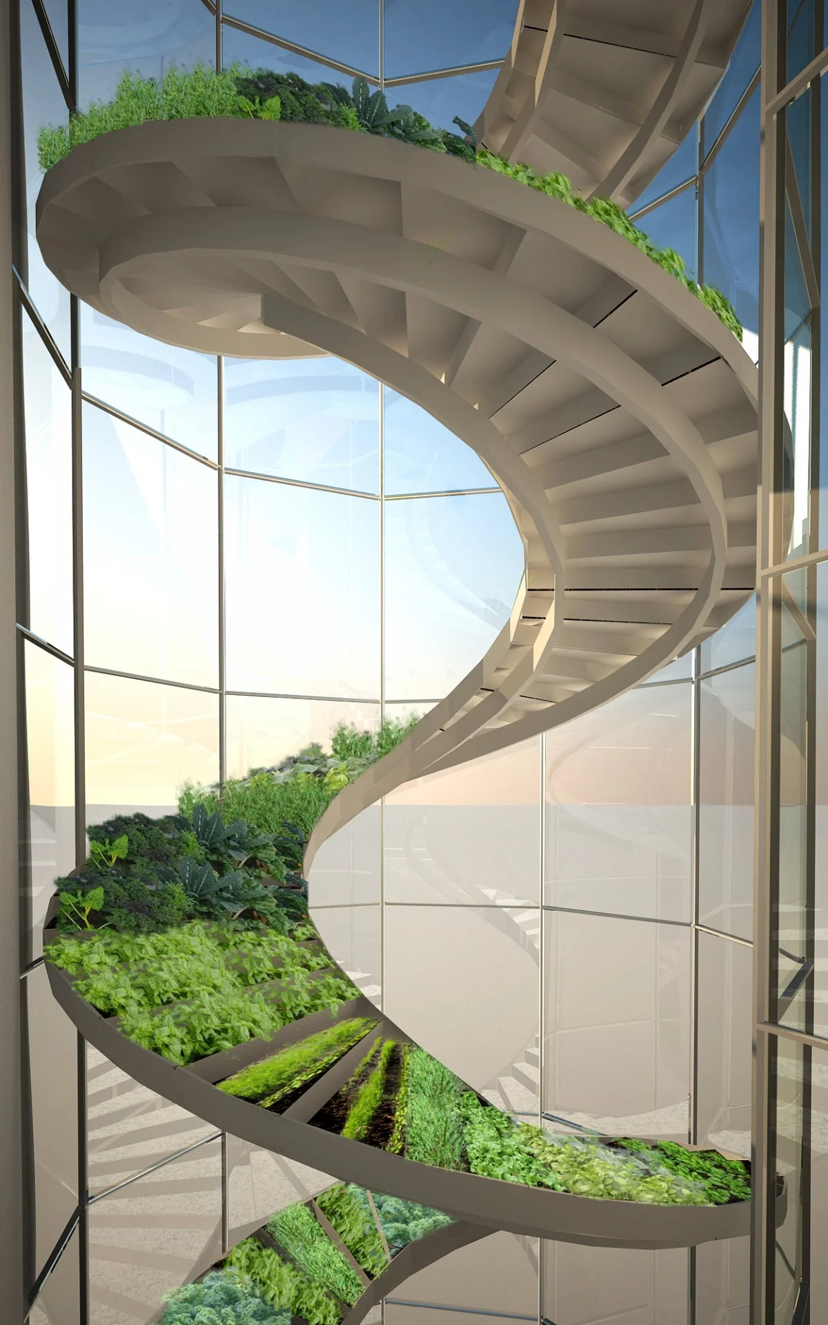 This plantscraper will include a spiraled food production line, which automatically moves the plants from the bottom to the top and back again while they grow. The length of the cycle would depend on the crop, but would normally take around 30 days, Hassle said.