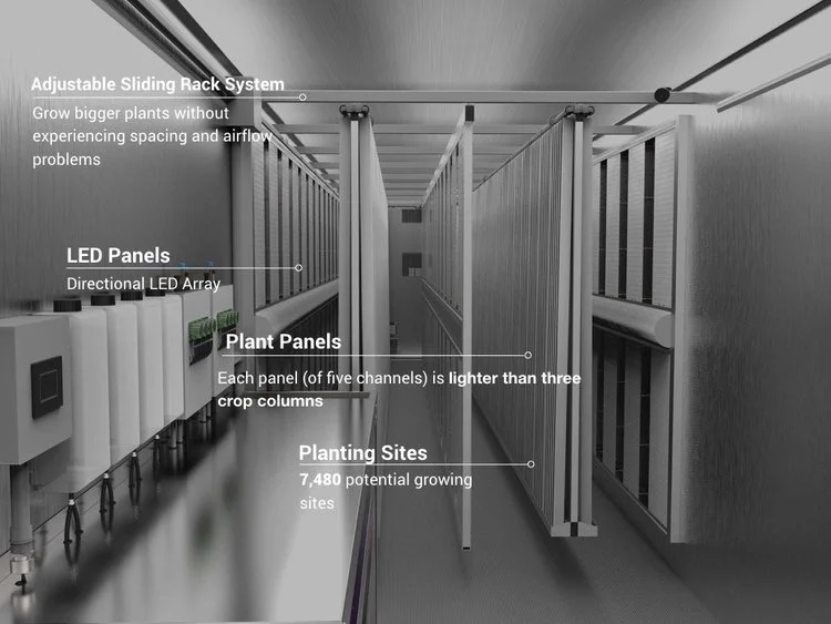 DB: There are a few ways to do that. First is to come up with a compatible planting schedule where you have seedlings and mature plants on opposite walls of the farm so you have space to shift the rows. Then, there’s also spacers built into the racks themselves to maintain a minimum distance that protects most standard sized plants.