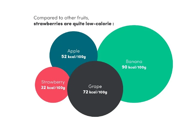 The caloric value of a strawberry is, on average, 32 kcal per 100g. A large strawberry weighs 50g. It supplies the energy needed for 10 minutes of walking or 5 minutes of biking.