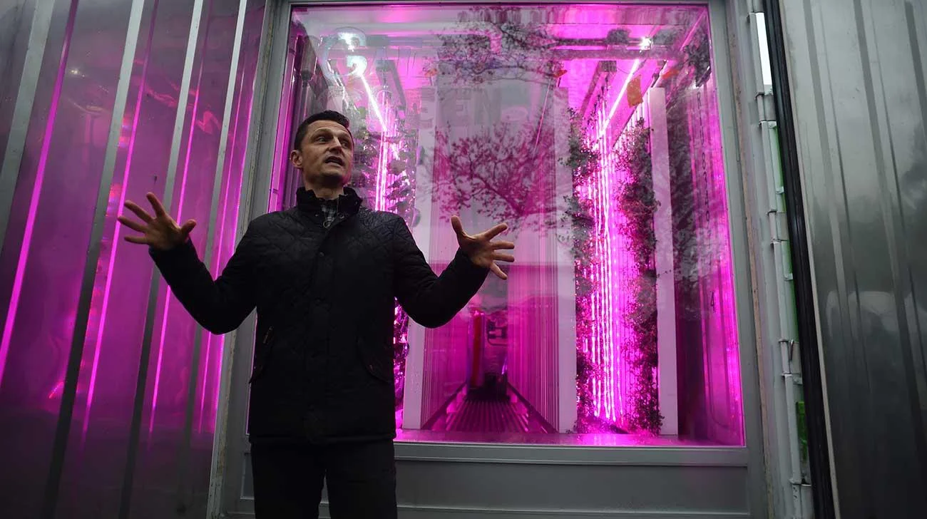 Tobias Peggs, CEO of Square Roots Urban Growers, speaks about urban farming outside one of the Square Roots containers on April 25, 2017 in New York. The urban farm craze is finding fertile ground in New York, where 10 young entrepreneurs are learning to grow greens and herbs without soil, bathed in an indoor, psychedelic light. Photo: Don Emmert/ AFP