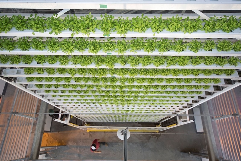 This 13,500 sq. ft. three-story stacked greenhouse utilizes a 1/10 of an acre to grow an annual amount of produce equivalent to 5 acres of traditional agriculture.