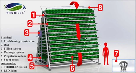 The Automatic Vertical Thorilex Hydroponic System is made from stainless steel. "It brings up to 9 times higher production, easier harvesting and better climate for the plants. The system can be up to 8 meters high and it is possible to choose from different growing boxes by species of plant. It is also equipped with the special spraying system and is operated with a control and security system."