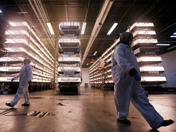 Workers at AeroFarms in Newark, New Jersey where LED lamps nourish plants in a former paintballing venue (Reuters)
