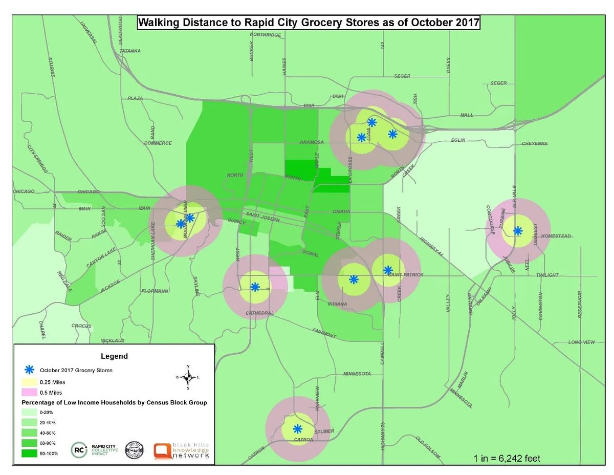 “National statistics tell us that a half a mile, or a quarter mile, is about the distance a person could walk or have to go with limited transportation with their groceries. Any more than that would be outside of that range and be very difficult to get the groceries that you need,” Corbine says. “That’s what we’re looking at. What’s a quarter mile from the grocery stores? What’s a half mile away from the grocery stores? When you remove those three grocery stores it really puts a hole in Rapid City.”