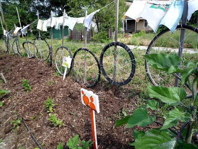 A combined fence, recycled-tire trellis and clothesline at the Earth Works community garden in Detroit. Photo by Jessica Reeder, courtesy of Wikimedia Commons, CC BY-SA 2.0.