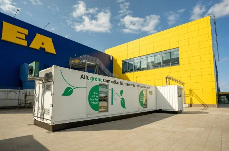 In an Urban farming pilot project, we grow leafy greens in a nutritious fluid, in a container powered with 100% renewable energy outside the IKEA Malmö store in Sweden