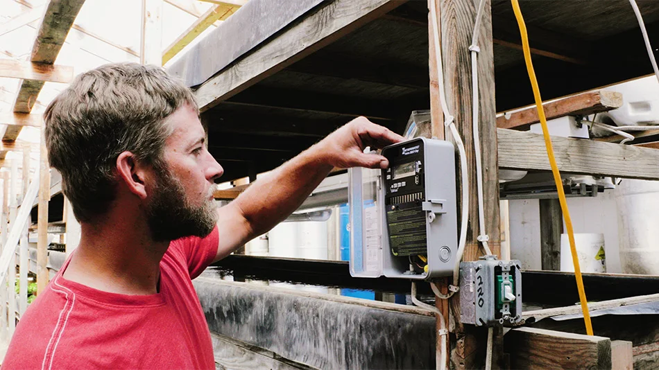 Nate Storey, founder of Bright Agrotech, examines lettuce growing in the company’s patented vertical towers. The Laramie company has been acquired by a Silicon Valley firm but will continue operating in Wyoming. (UW Photo)