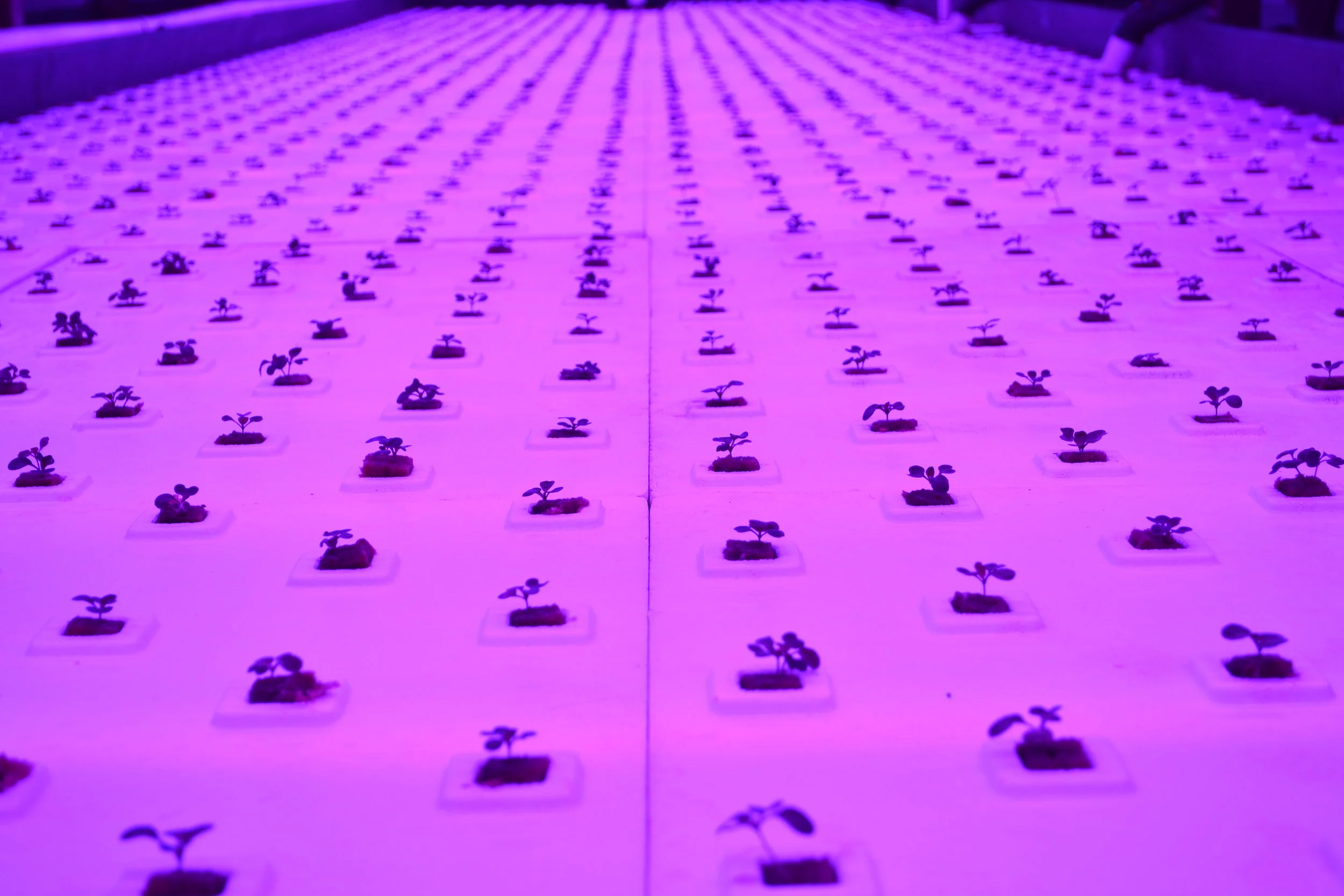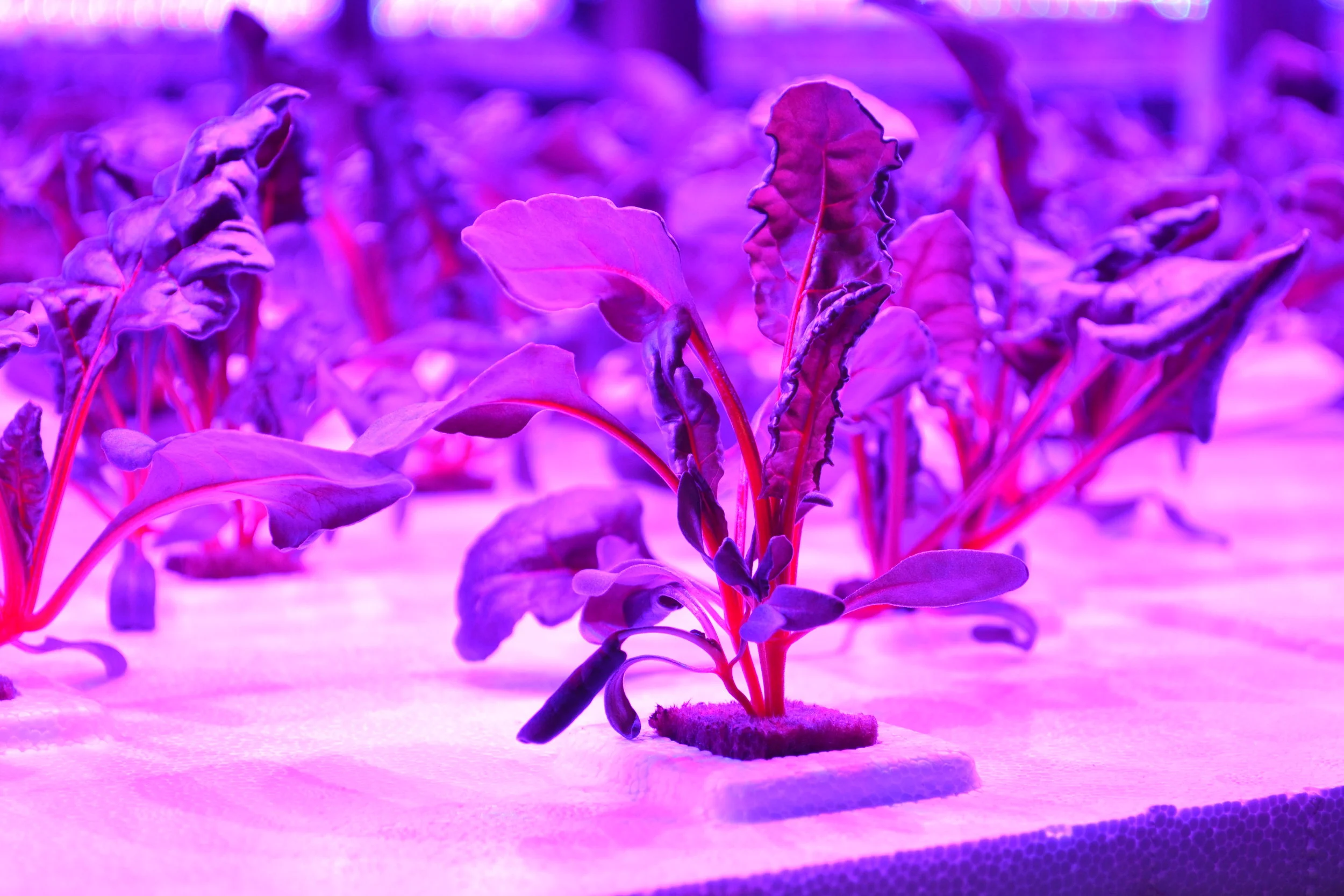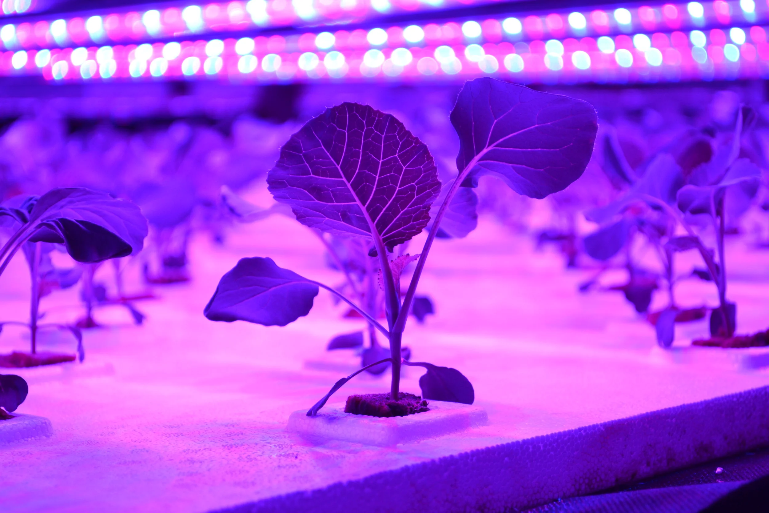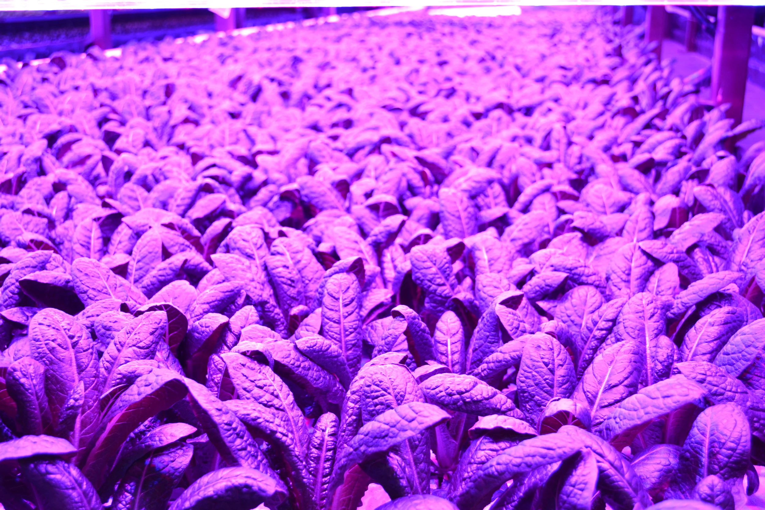 About 1000 sq. metres of growing space are available, where plants are under red and blue LED lights and fed hydroponically.