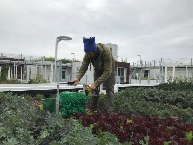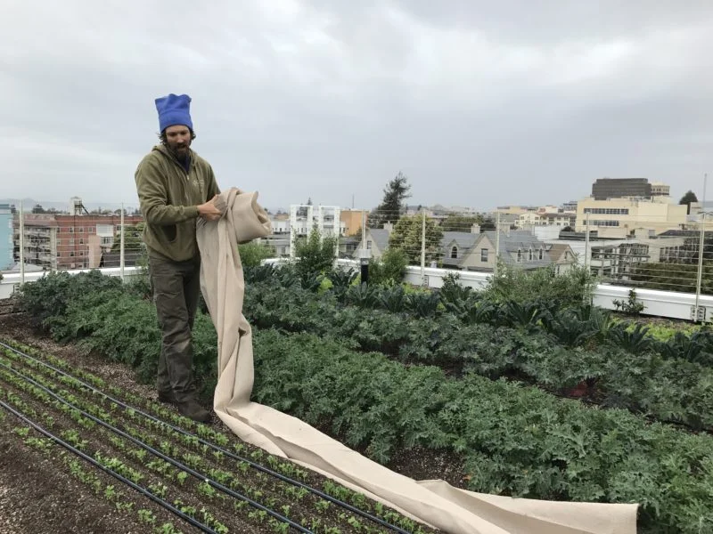 Benjamin Fahrer at work at the Top Leaf Farms location on the roof of 2201 Dwight Way in Berkeley. Photo: Alix Wall