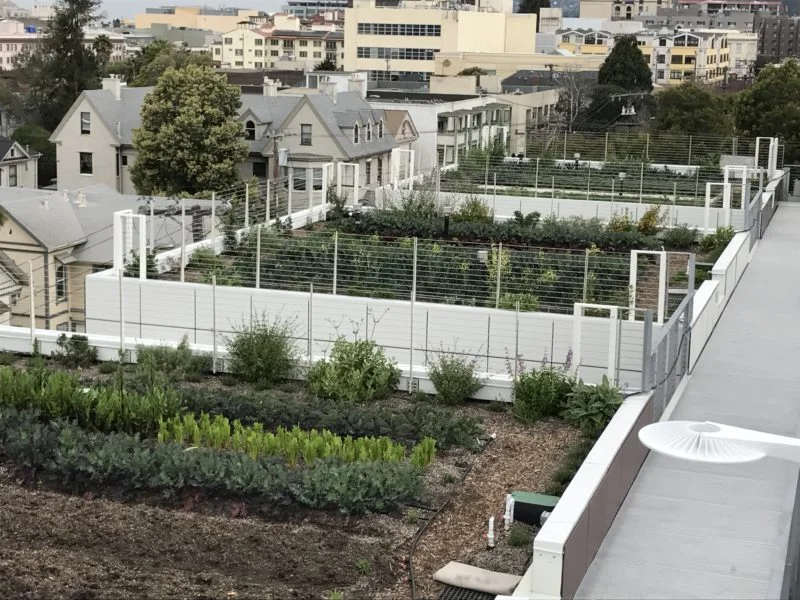 Whatever challenges a rooftop presents, though, are not apparent to a farming novice visiting the roof on Dwight. One can walk through numerous terraces and see neat rows of crops growing; it looks no different than a regular farm, except for the fact that you can also see the tops of nearby office buildings and past those, the Bay Bridge in the distance.