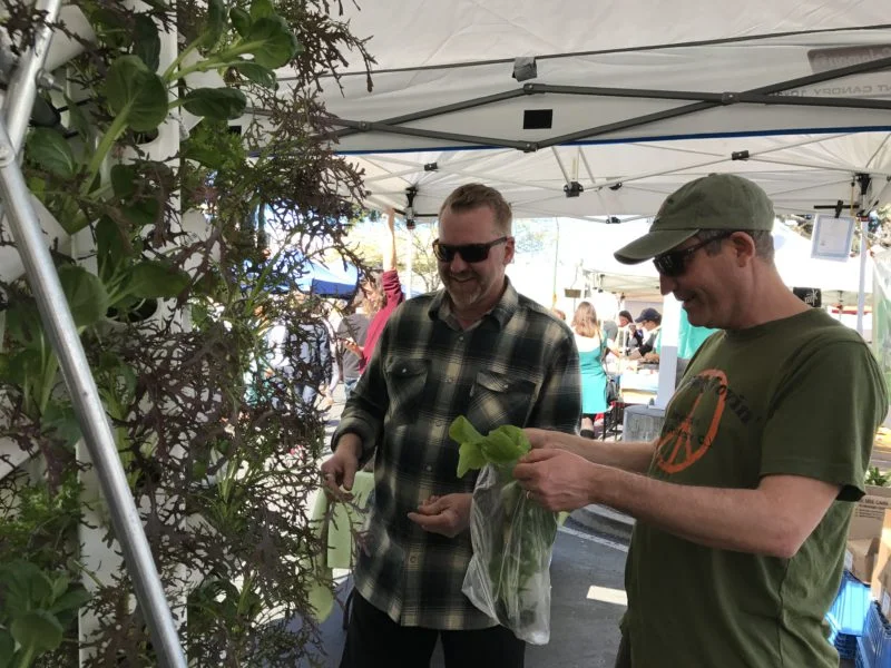 John Wichmann of Oaktown Farms (left) sells lettuce to Paul Bosky at the Temescal farmers market. Photo: Alix Wall