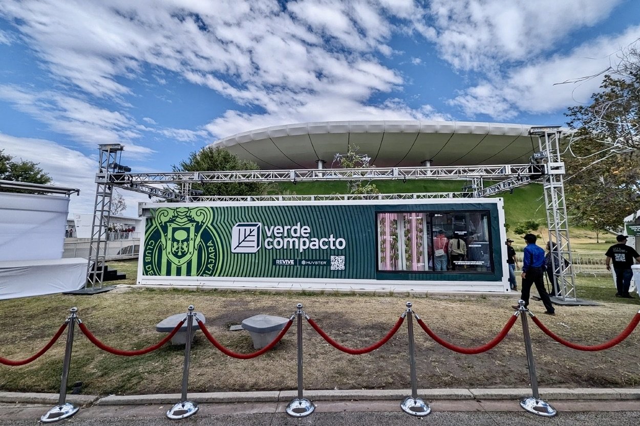 Verde Compacto has installed a full-scale vertical farm inside Estadio Akron, home to Club Deportivo Guadalajara (Chivas). Just beyond the stands, a container system grows leafy greens, herbs, and wheatgrass for direct use in the stadium's kitchens.