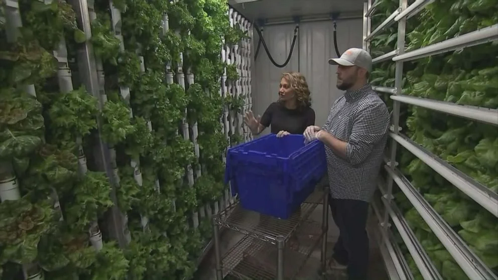“This is a 40 foot high cubed, insulated container that has been repurposed and then engineered to [with] three grow walls,” Walker told ABC News’ Ginger Zee. “[We can grow] right around two and a half acres to three acres of farmland in this container.”
