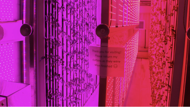 Small plants grow inside Mid-Ohio Food Collective's LED-light year-round mobile growing center at Mid-Ohio Farm on the Hilltop. Allie Vugrincic / WOSU