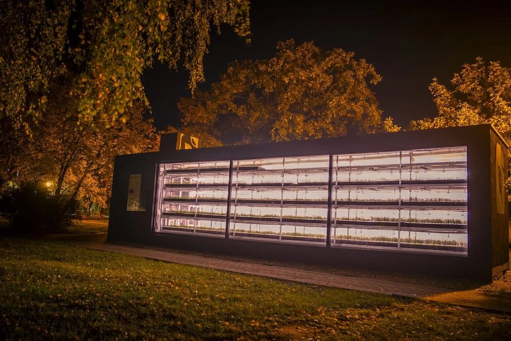 Green thinking and circular economy principles are also integrated into the design of the automated nursery—the base structure is a reused, decommissioned shipping container, clad in durable thermo-wood that ensures longevity as well as natural visual appeal. One wall of the container is designed as a glass viewing window so that anybody can observe the growing process on site.