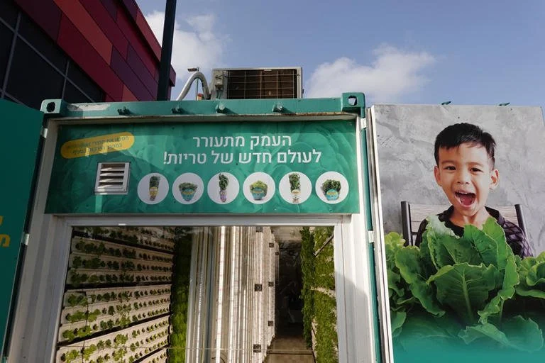 Photo shows a portable "vertical farm" beside a supermarket in the central Israeli city of Netanya, on Oct. 3, 2022. (Xinhua/Wang Zhuolun)