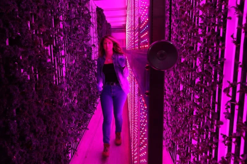 Mary Kathryn Scala inside the Freight to Plate shipping container in Fulton Market. Through hydroponic farming methods and cutting edge technology, Freight to Plate offers hyper-local, year-round produce. (Antonio Perez/Chicago Tribune)