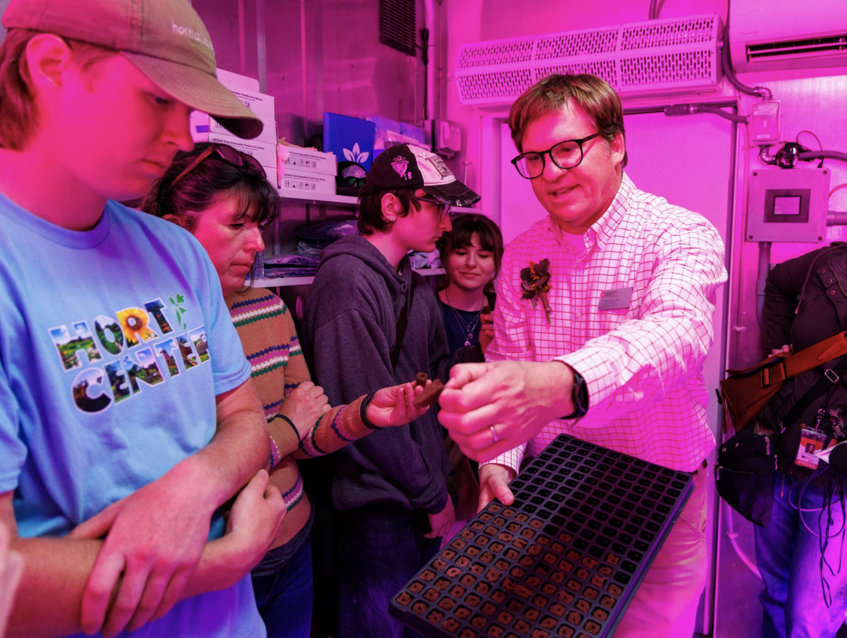 Professor of Agriculture David Kopsell gives a tour of ISU's new Vertical Farm. The converted shipping container is expected to produce 50 pounds of cilantro per week for campus dining services.