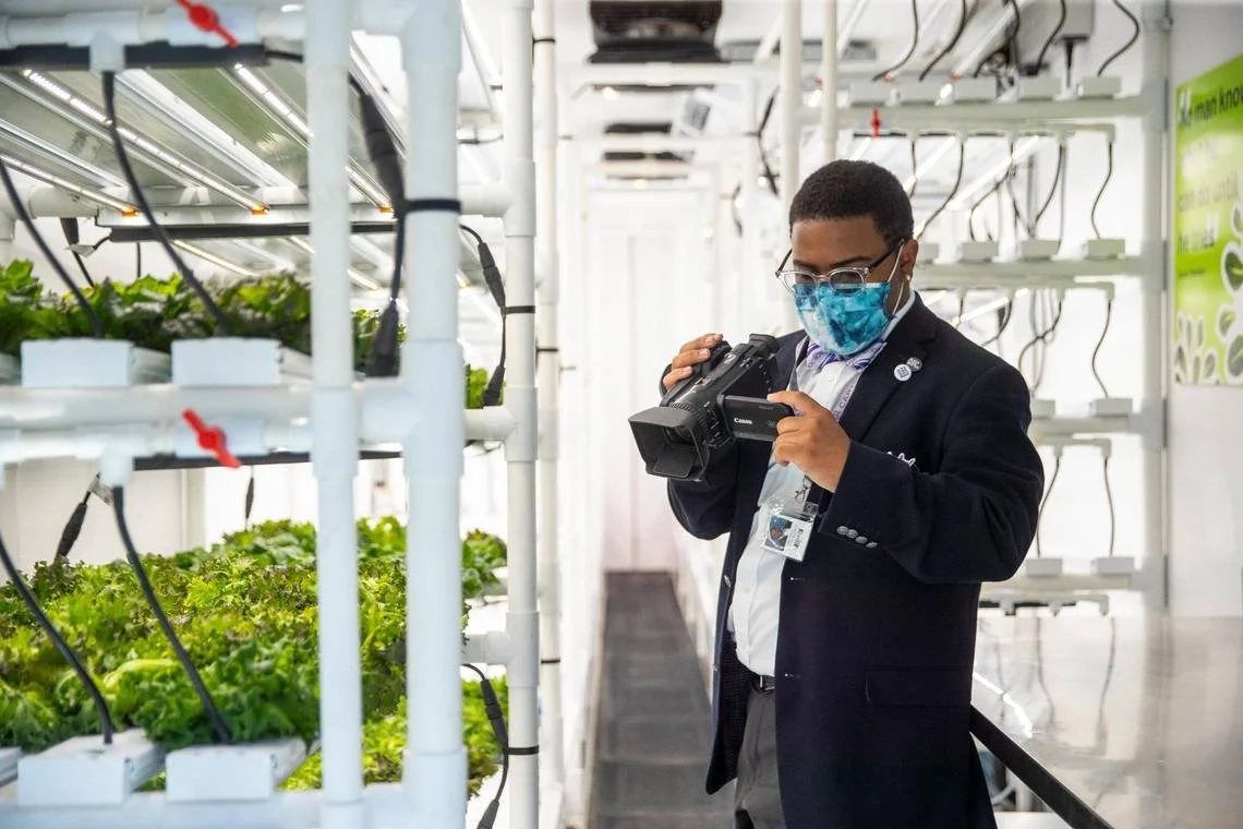 Jathan Briscoe, a 12th grader at Carter G. Woodson Academy, takes video of AppHarvest’s first container farm in an urban location, which is located outside the school, in Lexington, Ky., on Friday, Sept. 17, 2021. Ryan C. Hermens rhermens@herald-leader.com