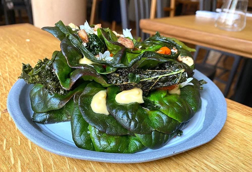 Apricity - Chantelle Nicholson's sustainable Mayfair restaurant had the critics (and Hot Dinners) salivating over her salad dish in particular. This is London red butterhead lettuce salad with miso aioli, sunflower seeds and crispy kale.
