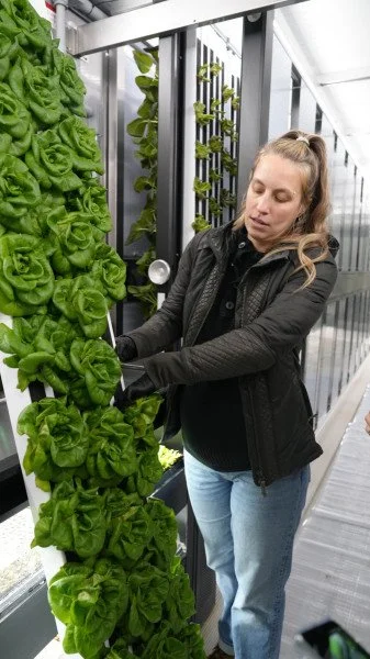 Community Link obtained its first freight farm in 2025 and Fresh Link Farms was born. By September, they had their first harvest. Since then, they’ve grown 21,000 plants: romaine lettuce, kale, collard greens, bok choy and other veggies. There has been a spirit of excitement about this project from the community and clients, said Whitney Berry, Community Link’s Director of Markets and Local Food.