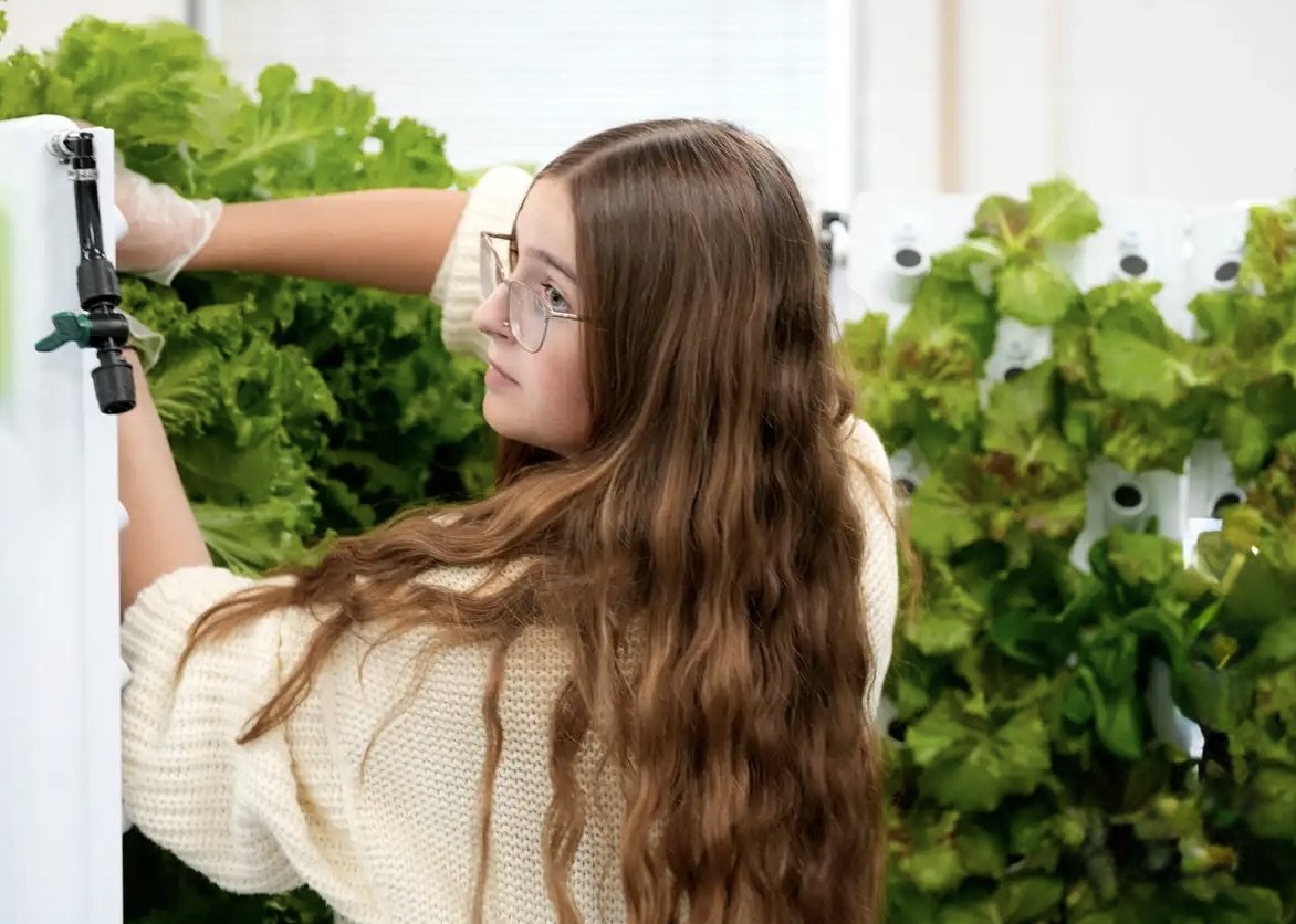 Amanda Estes, 17, harvests green star lettuce on Friday, Oct. 17, 2025, grown at Germantown High School's Flex Farm, an indoor mobile hydroponic farm from Fork Farms in Germantown, Wisconsin. Estes, a vegetarian, said she has learned a lot about plants' life cycles while participating in this class. "We can feed the entire cafeteria with the lettuce we produce here. I feel like I'm making a difference in our community. It's an amazing thing that I am proud to be a part of," she said.