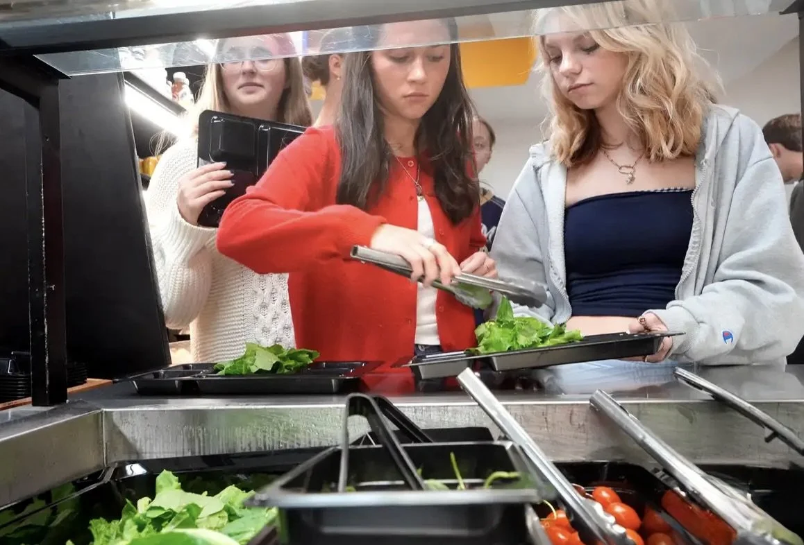 Emma Olszewski, center, gives fresh grown greens to classmate Hannah Leinbeck, right, both 16, while getting lunch at Germantown High School.