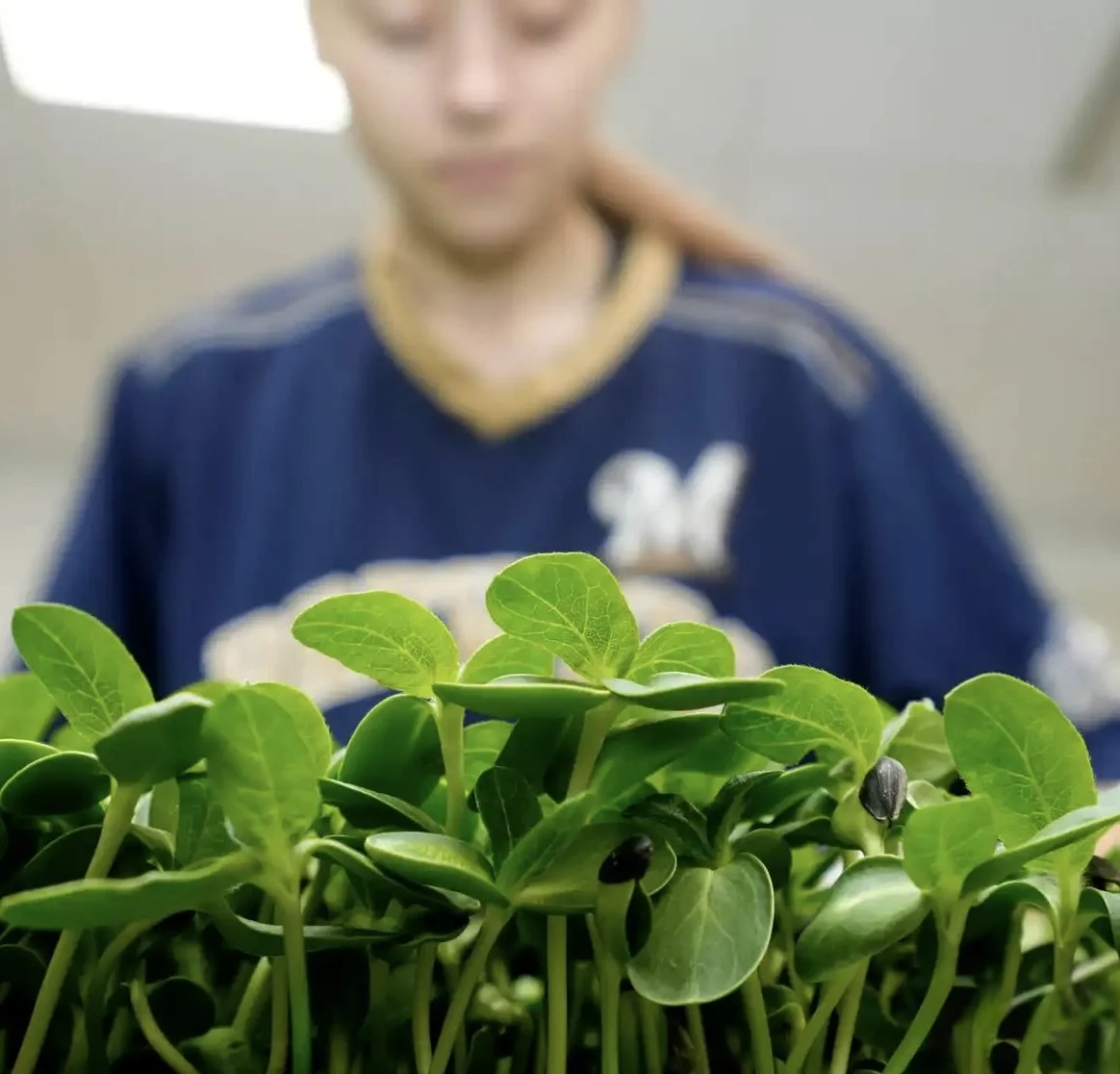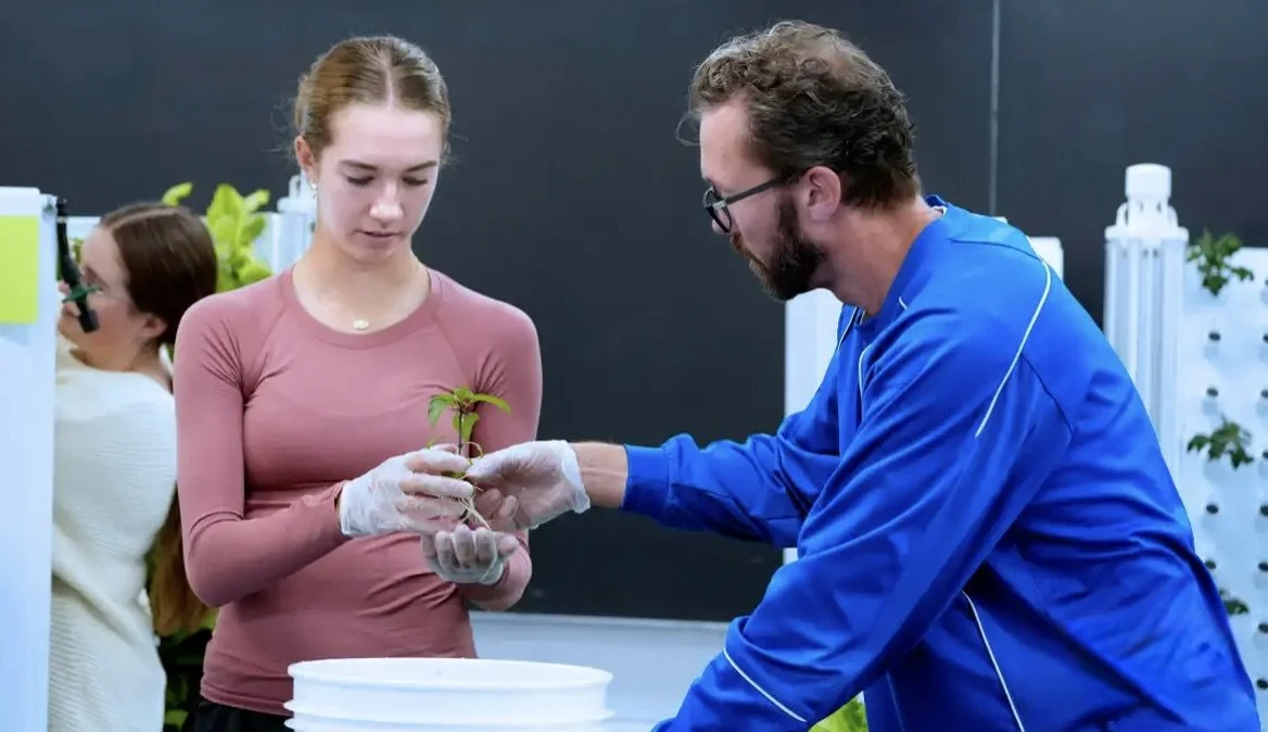 Students work in Germantown High School'sFlex Farm. The indoor mobile hydroponic farm allows schools to stretch meal budgets and introduce students to healthier foods.