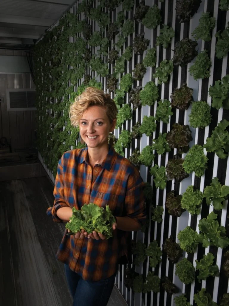 In November 2021, she bought a shipping container that had been upcycled for vertical farming and only four months later purchased a second. She raises a mix of salad greens, basil and edible flowers.